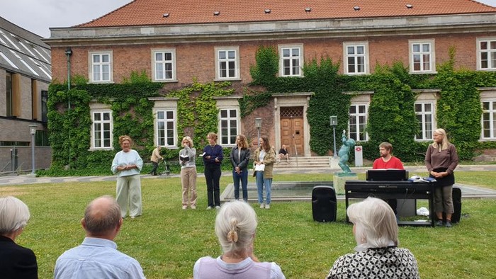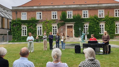 Fællessang i den smukke Domhusgård ved siden af Solbjerg Kirke. Vi synger Midsommervisen og andre sommersange. Solbjerg Kirkes Kor støtter fællessangen og optræder med et par korsange. Vi hilser hinanden god sommer med et glas hvidvin.